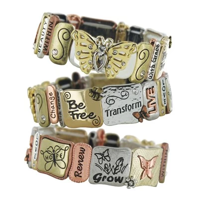 Spread your wings and rise to new heights! This unique bracelet has custom-designed tiles in multiple finishes and textures with bursts of crystals throughout. One style stretches to fit any size. Lift your spirits high with butterflies and inspirational words such as renew, grow, love, beauty within, with grace, change, be free, transform, and live!