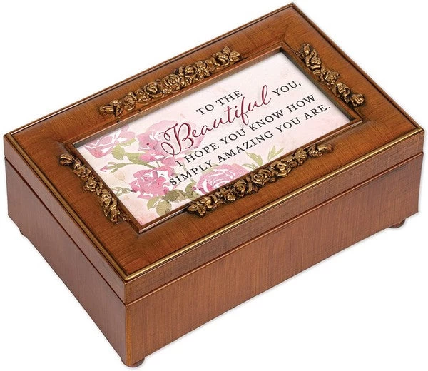 Be encouraged by message that reads, “To the beautiful you. I hope you know how simply amazing you are.” Hinged lid design with embossed rosettes accents the frame. Plays melodic tune You Light Up My Life. It is a perfect gift that will be cherished for years to come for a special someone.