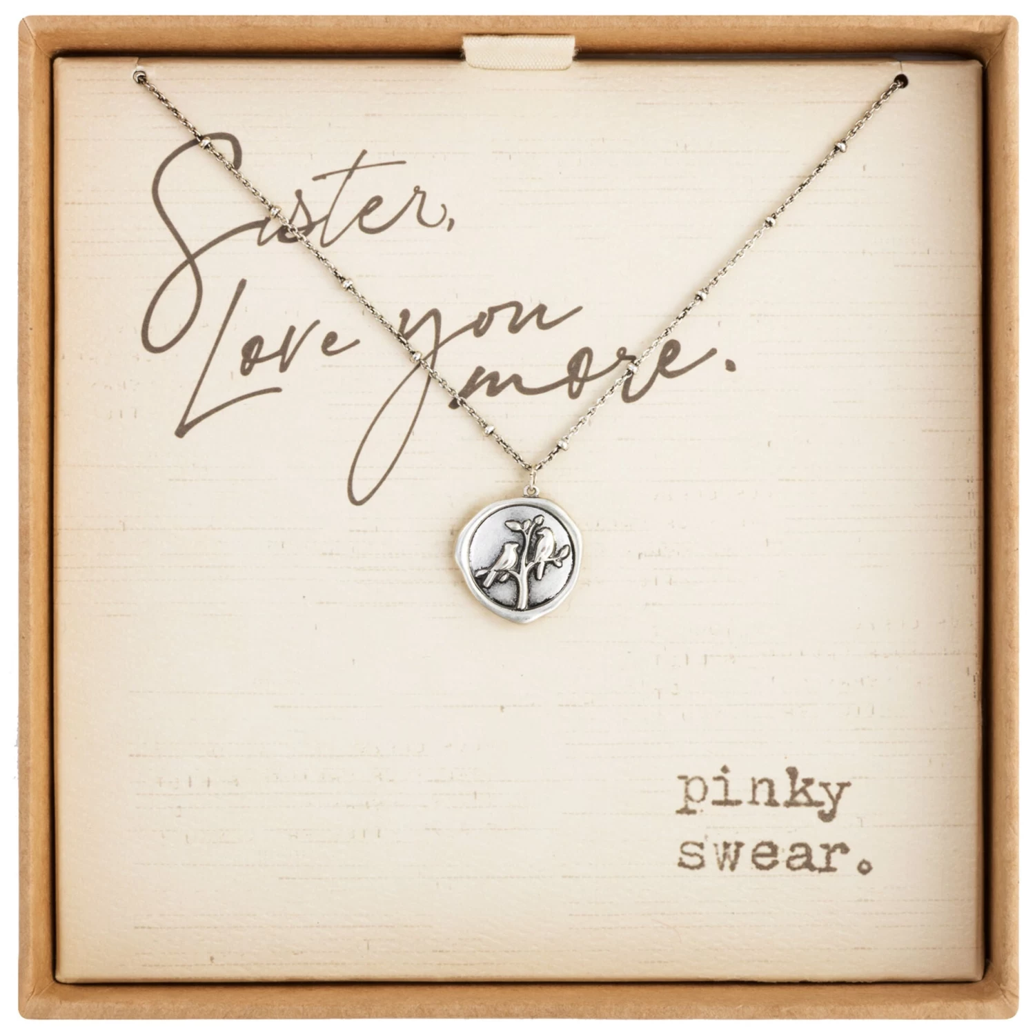 Two birds sit on the branch of the same tree in this lovely silver-finish necklace that conveys a sweet sentiment to a beloved sister. With an irregular round shape resembling a wax letter seal, this embossed charm on silver-finish chain provides a wearable reminder of the bond of you share with your sister or a friend who is like a sister. Gift-box packaging includes a letter-style message—complete with a pinky swear!