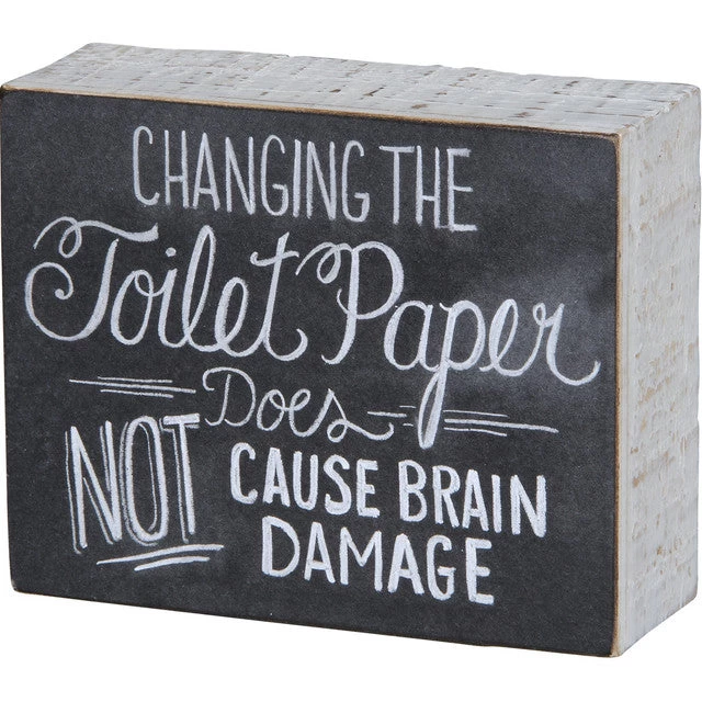 A black and white wooden chalk art box sign lending a hand lettered “Changing The Toilet Paper Does Not Cause Brain Damage” sentiment. Great for gifting and is easy to hang as a humorous bathroom wall accent or can free-stand alone.