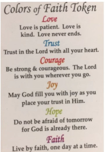 Colors of Faith Token: LOVE is patient, Love is kind, Love never ends. TRUST in the Lord with all your heart. Be strong and COURAGEous. The Lord is with you wherever you go. May God fill you with JOY as you place your trust in Him. HOPE Do not be afraid of tomorrow for God is already there. Live by FAITH, one day at a time.