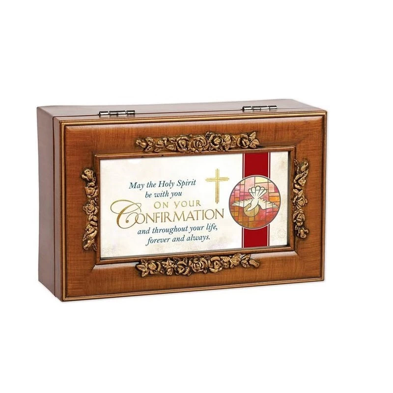 Celebrate and remember the confirmation day with this beautiful keepsake music box. It features woodgrain style finish with raised panel detail and hinged frame lid. Plays melodic tune On Eagle’s Wings. Ready for giving. This music box will be cherished for many years to come.
