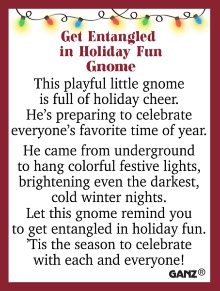 This playful little gnome is full of holiday cheer. He’s preparing to celebrate everyone’s favorite time of the year. He came from underground to hang colorful festive lights, brightening even the darkest, cold winter nights. Let this gnome remind you to get entangled in holiday fun. ‘Tis the season to celebrate with each and everyone!