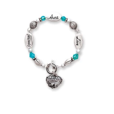 This is a beautiful bracelet in attractive sterling silver finish. It has faceted beads and a silver heart-shaped dangle charm. It is beautifully gift boxed with a corresponding verse card enclosure that reads “Special Aunt Love…An aunt is someone special that is held so very dear…Embracing us with love and warmth… Whenever she is near…”.