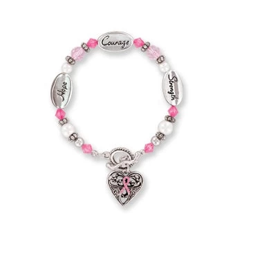 A simple sentiment in a modern keepsake for someone special! This toggle bracelet is finished in delicate silver tone with sentiment discs that say Hope, Courage & Strength. It is adorned with a heart-shaped dangle charm and pink beads. It is gift box adorned with special message. Its the perfect gift to express your support!