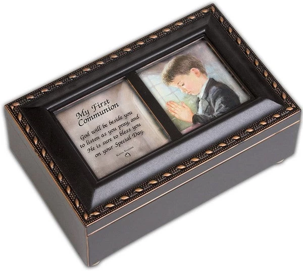 Celebrate and remember the first communicant’s holy day with this beautiful keepsake music box. This wood-look musical keepsake box has an black wood finish and a subtle embossed edge. The First Communion insert, with art by Kathryn Fincher, can be easily changed out to a photo of your first communicant.