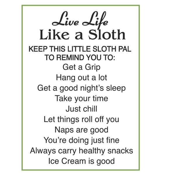 Live life like a Sloth: Keep this little sloth pal to remind you to get a grip. Hang out a lot. Get a good night’s sleep. Take your time. Just chill. Let things roll off you. Naps are good. You’re doing just fine. Always carry healthy snacks. Ice cream is good.