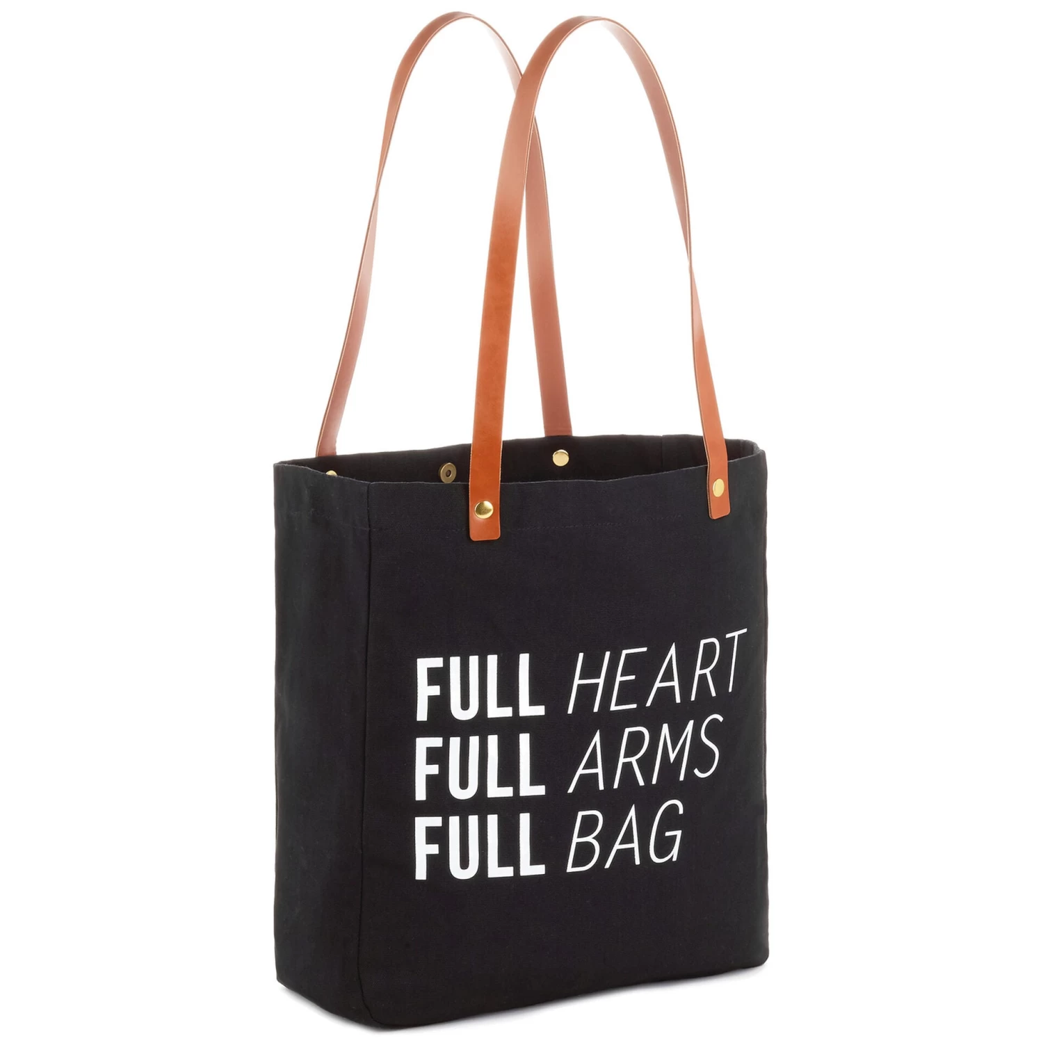 - Canvas tote bag with faux leather straps features whimsical quote about parenting.