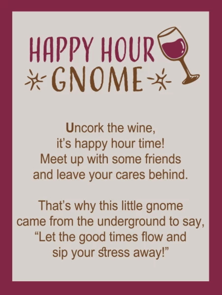 Uncork the wine, it’s happy hour time! Meet up with some friends and leave your cares behind. That’s why this little gnome came from underground to say, “Let the good times flow and sip your stress away!”