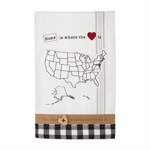 Cotton hand towel includes wood button lapel pin to mark where “the heart is.” Material: Cotton. Size: 26″ x 18 1/2″.