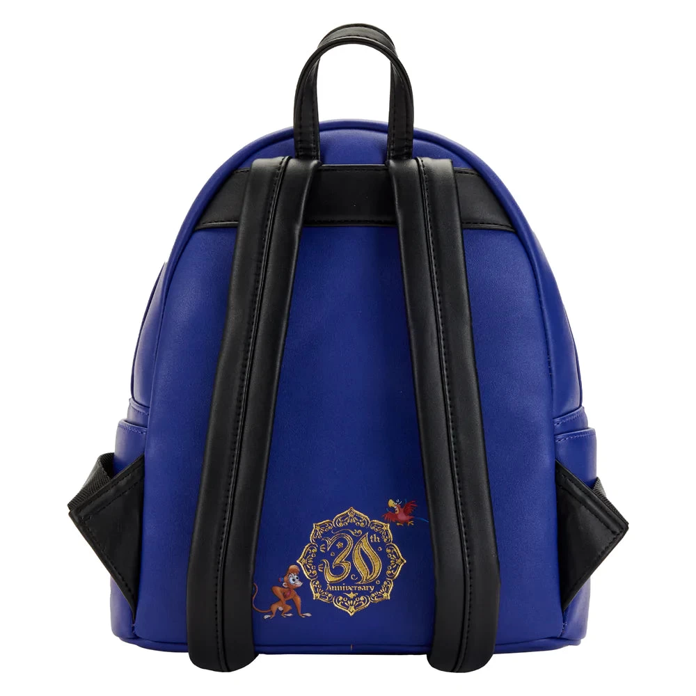 Take flight on a star-filled magical adventure with this Loungefly Disney Aladdin 30th Anniversary Mini Backpack. On the front of the applique pocket, a grand cast of characters floats by, including Aladdin, Jasmine, and Abu on a magic carpet. Genie watches overhead while Rajah perches on the Cave of Wonders. The Sultan’s Palace sparkles in the distance. Jafal, Iago, and the Sultan himself make an appearance as well. Underneath, a mystical haze emanates from the spout of the magical golden lamp. A scarab enamel zipper charm pulls to open the front compartment. On the back, Abu and lago make an encore appearance, along with a special, metallic debossed 30th Anniversary 8-point star logo. This backpack is the perfect accessory for pairing with Disney outfits or transforming everyday outings into magical journeys.