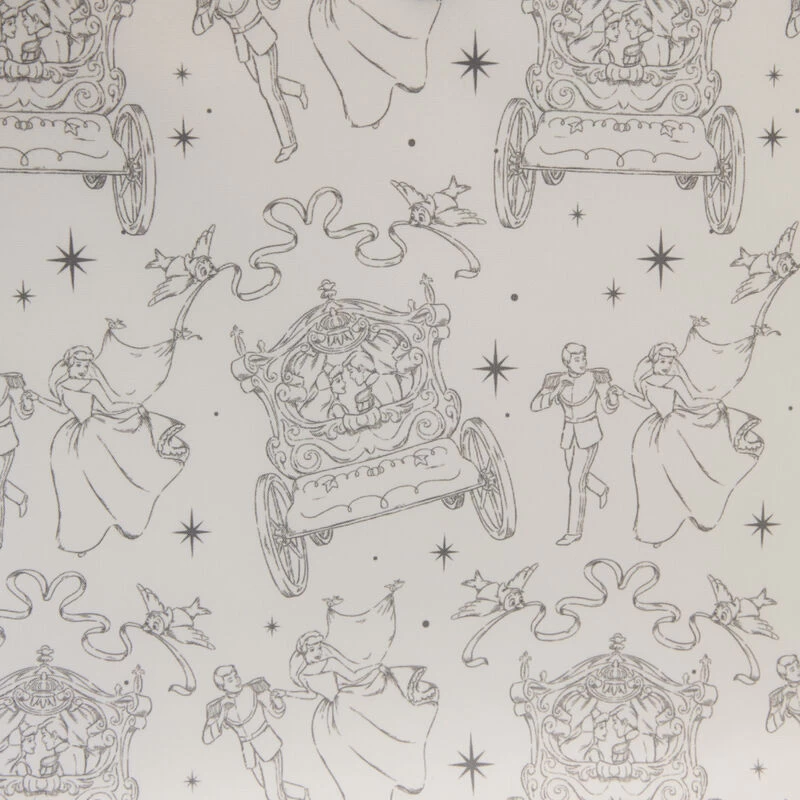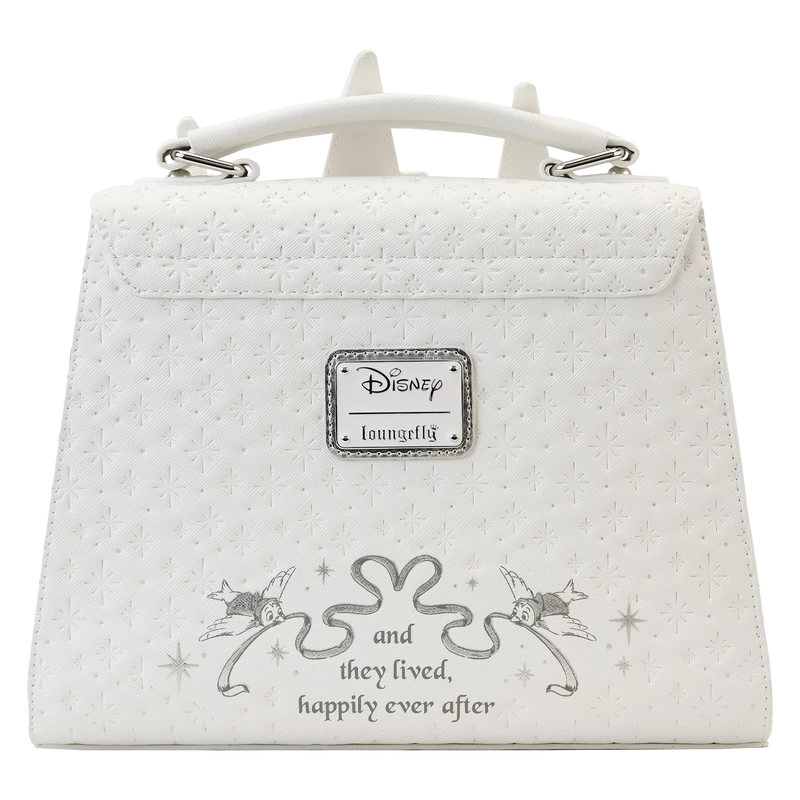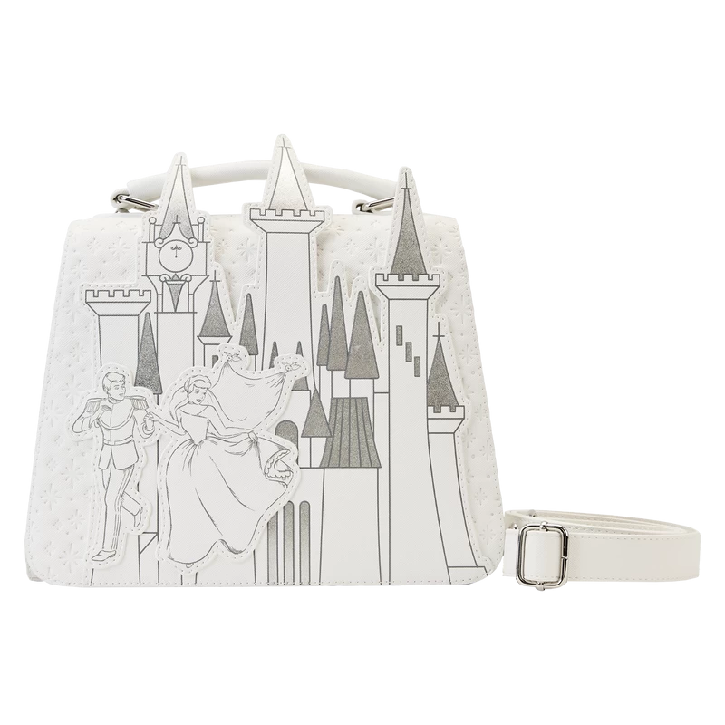 The Loungefly Disney Cinderella Happily Ever After Crossbody Bag is made of vegan leather (polyurethane). Bag has adjustable shoulder straps (removable), vegan leather, sturdy silver-colored metal hardware and chain strap, and printed, debossed, applique, and silver foil details. Notice the coordinating inside lining.