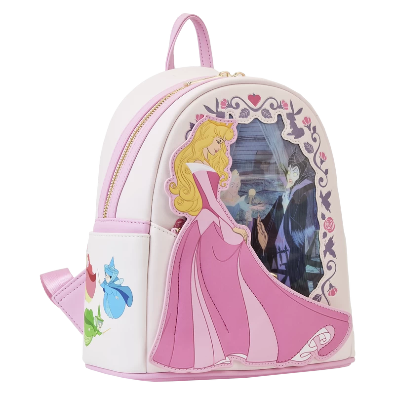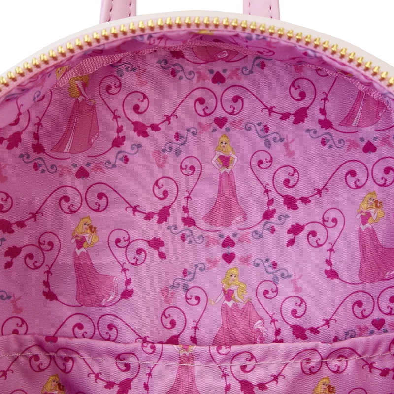 The Loungefly Disney Sleeping Beauty Princess Lenticular Mini Backpack is made of vegan leather (polyurethane). Bag has adjustable shoulder straps, side pockets, and shiny gold-colored metal hardware. Additional features include applique, lenticular, debossed, and printed details. Take note of the coordinating inside lining.
