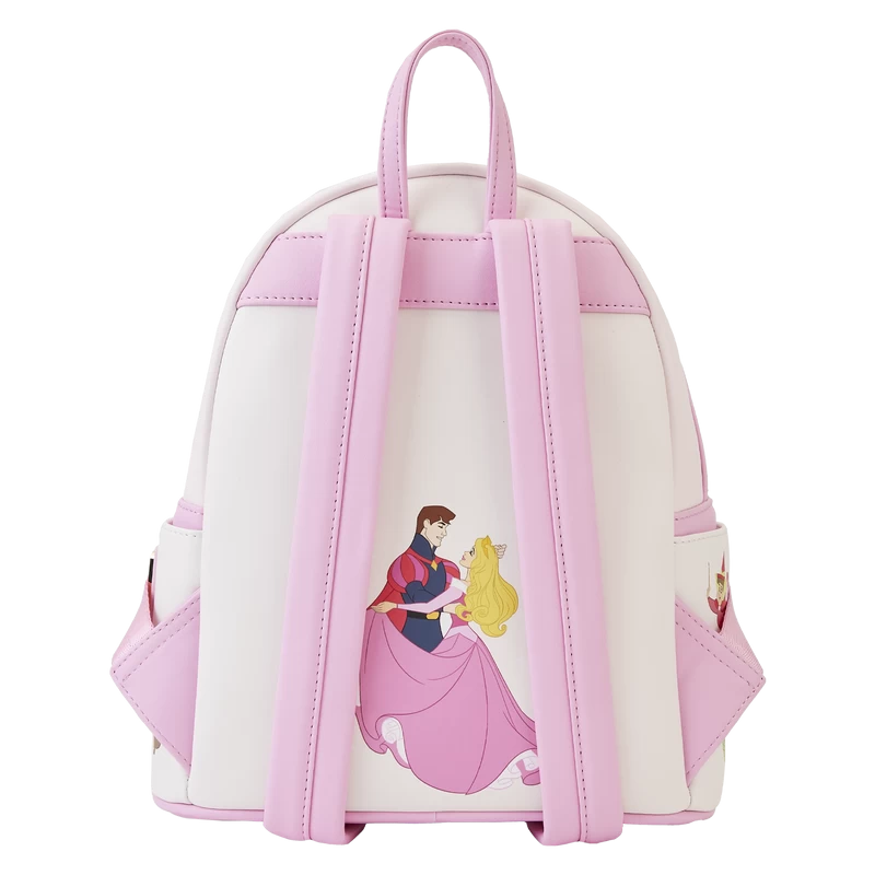 Dream up enchanting adventures with our Loungefly Disney Sleeping Beauty Princess Lenticular Mini Backpack. Disney’s Aurora graces the front, and she looks into a window, which reveals her future: she and Prince Phillip are dancing! Lenticular details, though, offer an alternate view in which she pricks her finger on the spindle of a spinning wheel, thus fulfilling Maleficent’s curse. Debossed flowers and woodland creatures frame the window, and a diagonal zipper behind Aurora’s pink flowing dress allows you to secure smaller items for all your journeys. On the side pockets, you’ll find the Good Fairies (Merryweather, Flora, and Fauna) and a woodland squirrel with flowers. Aurora and Prince Phillip dance together in an encore appearance on the back. Make a dreamy entrance wherever you go with this stylish vision of a backpack.