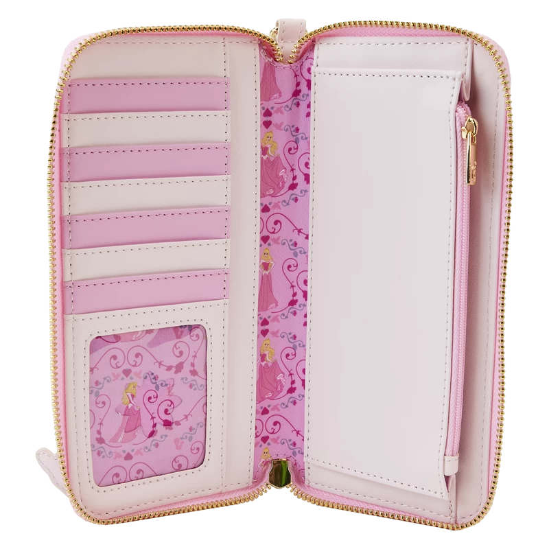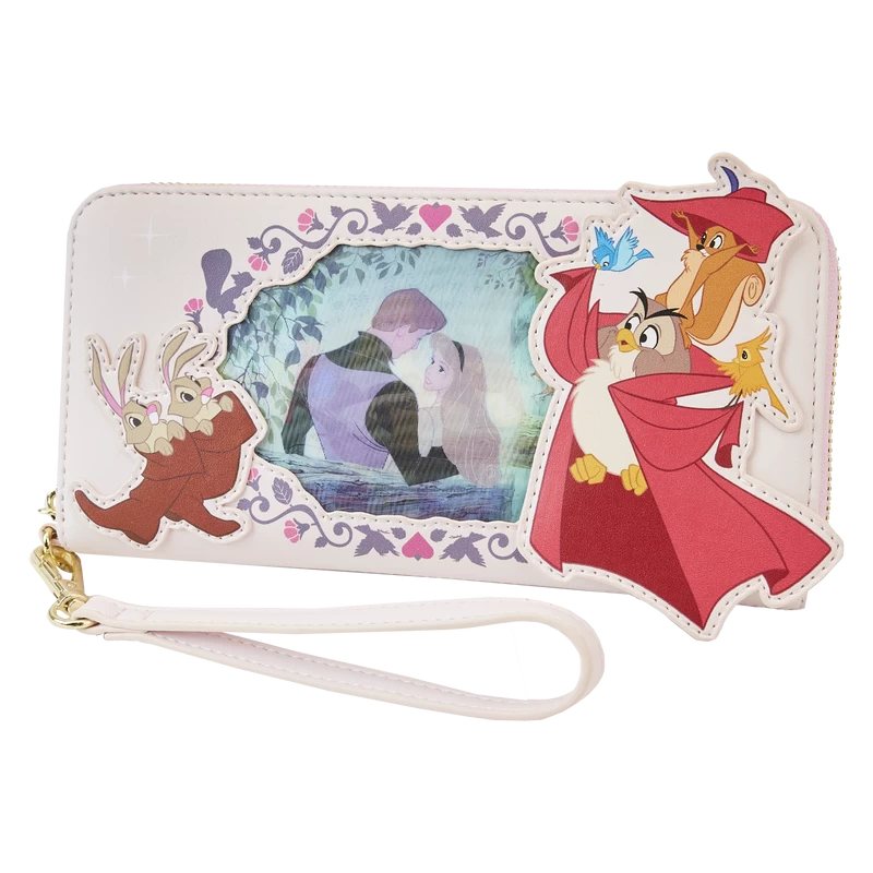 The Loungefly Disney Sleeping Beauty Princess Lenticular Wristlet Wallet is made of vegan leather (polyurethane). Wallet zips closed with shiny gold-colored metal hardware. Additional features include applique, debossed, lenticular, and printed details. Take note of the coordinating inside lining. This wallet is an officially licensed Disney product. Wallet dimensions: 8”W x 4”H