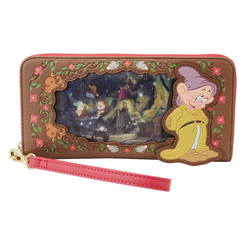Treasure the fairest memories of them all with our Loungefly Disney Snow White Lenticular Princess Series Zip Around Wristlet Wallet. This accessory is a real gem, filled with all kinds of unique details. On the front, Dopey stands before a frame decorated with woodland creatures in debossed detail. The picture inside reveals the Seven Dwarfs in the diamond mine. Lenticular details reveal an alternate view of Snow White approaching the cottage in the woods, in the company of deer, rabbits, and other animals of the forest. Inside, you’ll find 8 slots for holding cards and 1 clear slot for displaying your ID. A die-cut shape of an apple adds a charming touch. An extra zipper compartment creates more space for storage, and the wristband allows you to carry your valuables with ease. The larger size of this wallet also accommodates most cell phones. Take along this accessory for breezing through your day in royal style.