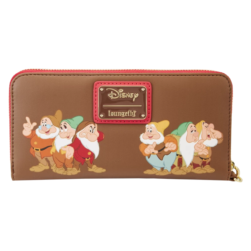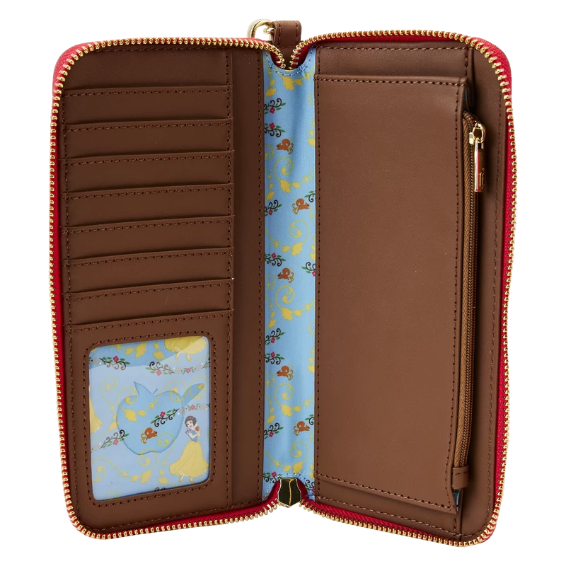 The Loungefly Disney Snow White Lenticular Princess Series Zip Around Wristlet Wallet is made of vegan leather (polyurethane). Wallet zips closed with shiny gold-colored metal hardware. Additional features include applique, debossed, lenticular, and printed details. Take note of the coordinating inside lining.
