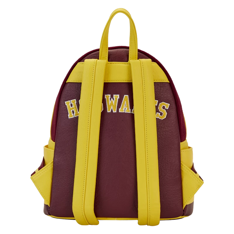 It’s time to show your house pride Hogwarts alumni! The Loungefly Harry Potter Gryffindor Varsity Mini Backpack will keep your necessities secure and represent your wizarding house and school of choice. Made with wool, this backpack replicates the classic varsity jacket style complete with a striped collar (made of vegan leather), chenille patch, Hogwarts Crest, and “Hogwarts” written across the back. This design truly embodies the “boldness” of Gryffindor with gold accents to the maroon base color. It’s a great accessory to complete a casual fandom outfit or dress up for your post-graduation cosplay. Backpack features include sturdy gold-colored metal hardware, adjustable straps, wool, vegan leather (polyurethane), side pockets, applique, chenille patch, metal snap buttons, and embroidered details. Note the coordinating lining.