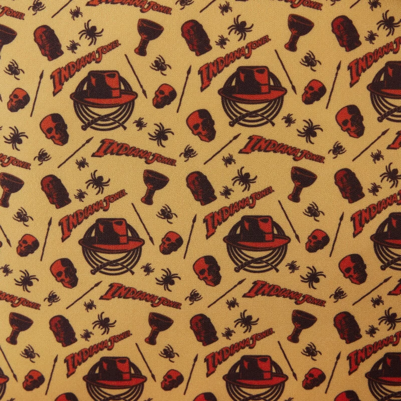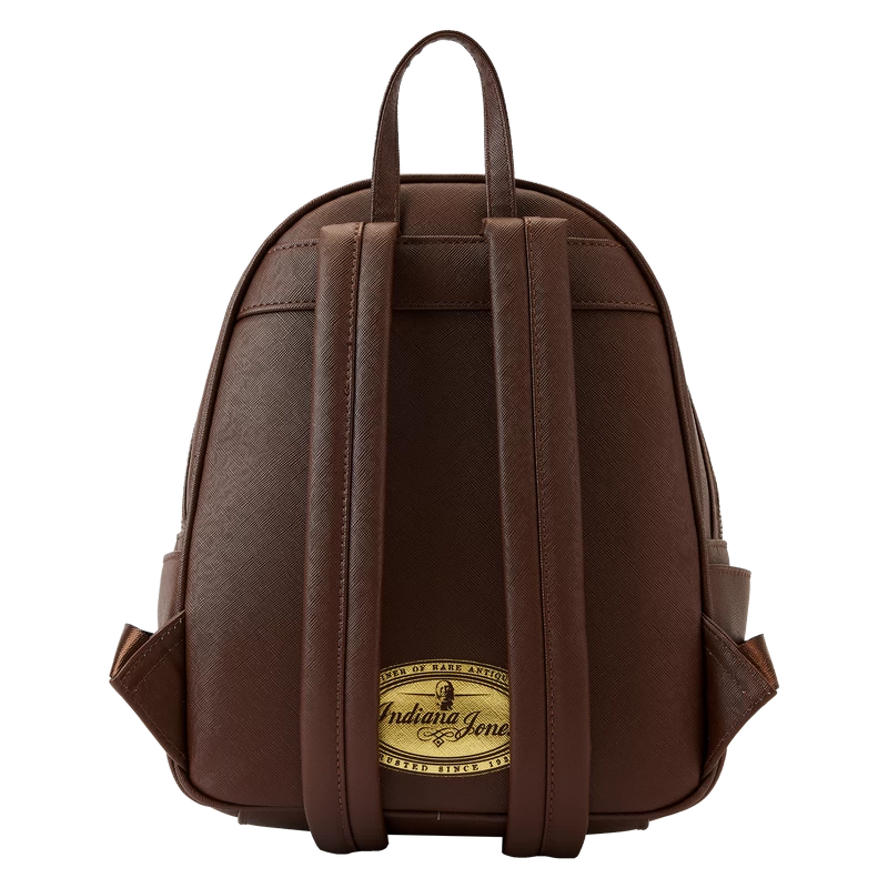 The Loungefly Indiana Jones Raiders of the Lost Ark Mini Backpack with Coin Purse is made of vegan leather (polyurethane). Backpack has adjustable shoulder straps and sturdy antique gold-colored metal hardware. Additional features include debossed, embossed, gold foil, and printed details. Take note of the coordinating inside lining.