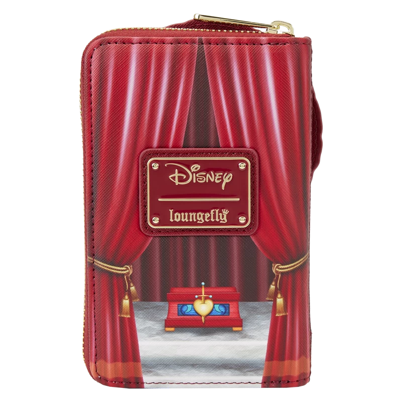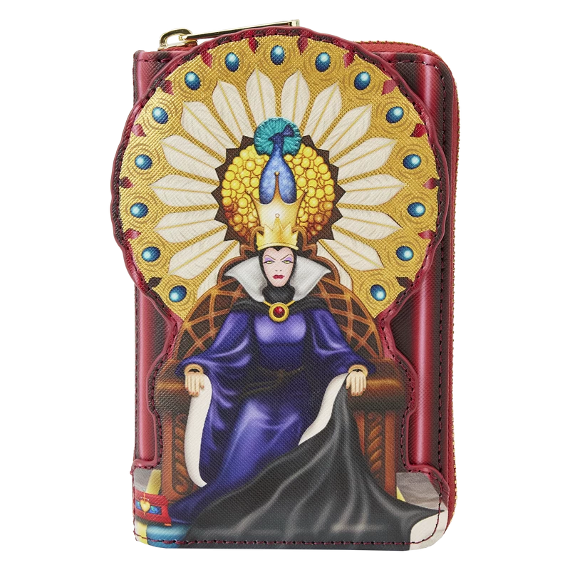 Elegantly evil and ready to rule! Bring on the reign with our Loungefly Disney Snow White Evil Queen Throne Zip-Around Wallet! The Evil Queen is looking particularly regal in the throne room. All artwork on this wallet is original and hand-drawn in-house by our artists. Applique and gold-foil details add a royal touch. A circle of peacock feathers surrounds the Evil Queen on the front of the wallet, which rises up over the top. The box, meant to keep Snow White’s heart, appears on the back, surrounded by red curtains from the throne room. Inside, you’ll find 4 slots for holding cards and 1 clear slot for displaying your ID. Keep your favorite animated moments close while adding wickedly royal fun to your everyday outings, with this exquisite accessory.