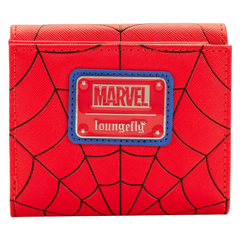 Stay stylish with this Loungefly Spider-Man Color Block Snap Wallet. Its design features a molded metal spider emblem and bold blue and red color blocks, accented with a contrasting web pattern. You’ll be able to fit your essentials and some extra in this stylish wallet.