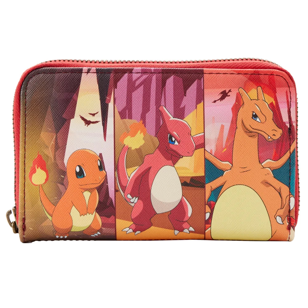 The Loungefly Pokémon Charmander Evolutions Zip Around Wallet is made of vegan leather (polyurethane). Wallet zips closed with sturdy metal hardware. Additional features include applique, debossed, and printed details. Take note of the coordinating inside lining.