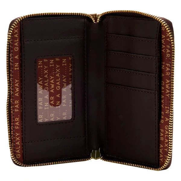 The Loungefly Star Wars Lands Jakku Zip Around Wallet is made of vegan leather (polyurethane). Wallet zips closed with sturdy metal hardware and features printed details. Take note of the coordinating inside lining.