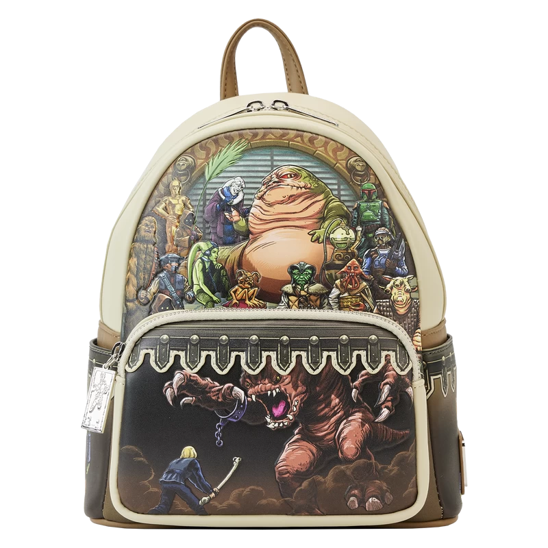 Brave the terrors of Jabba’s Palace and carry your bounty out with the Loungefly Star Wars™: Return Of The Jedi™ Jabba’s Palace Mini Backpack. This 40th Anniversary edition design captures an iconic cinematic scene from the third film in the Skywalker saga. On the front, in printed and debossed detail, is Jabba the Hutt along with his entourage above the Rancor pit where Luke Skywalker has been tossed. A metal Han in Carbonite zipper charm is the closure of the front pocket. Turn the bag around to find several more of Jabba’s minions. This galactic accessory makes a stellar addition to any outfit and is sure to elevate any Star Wars™ collection.