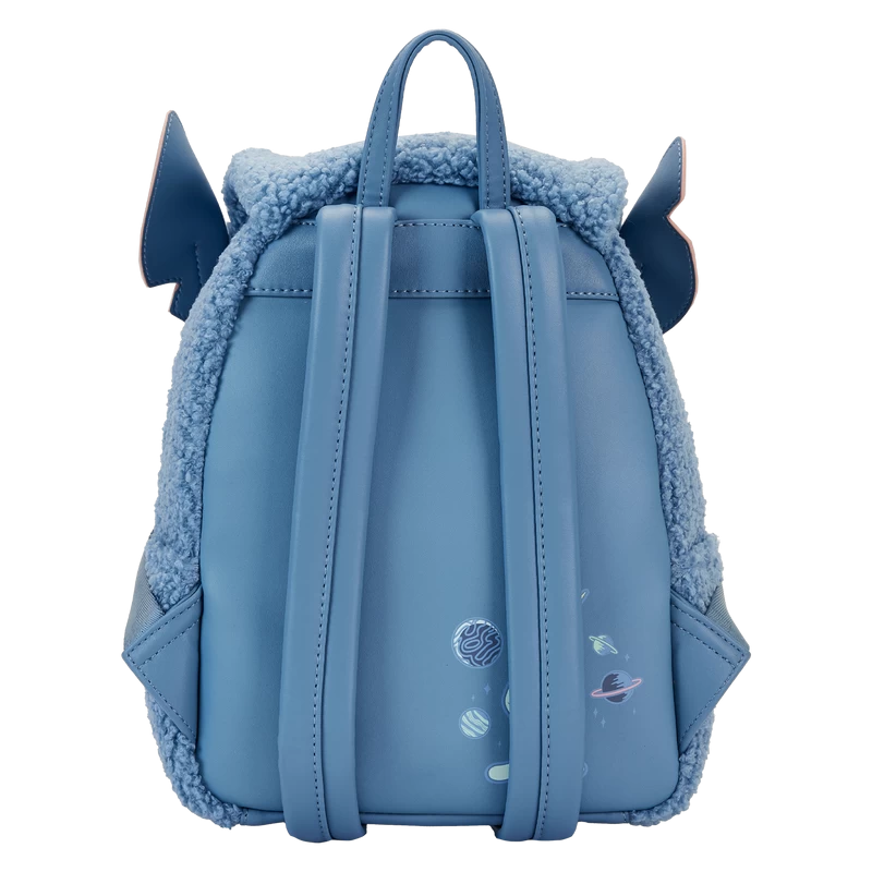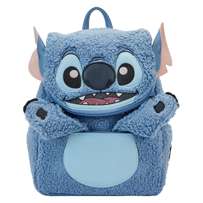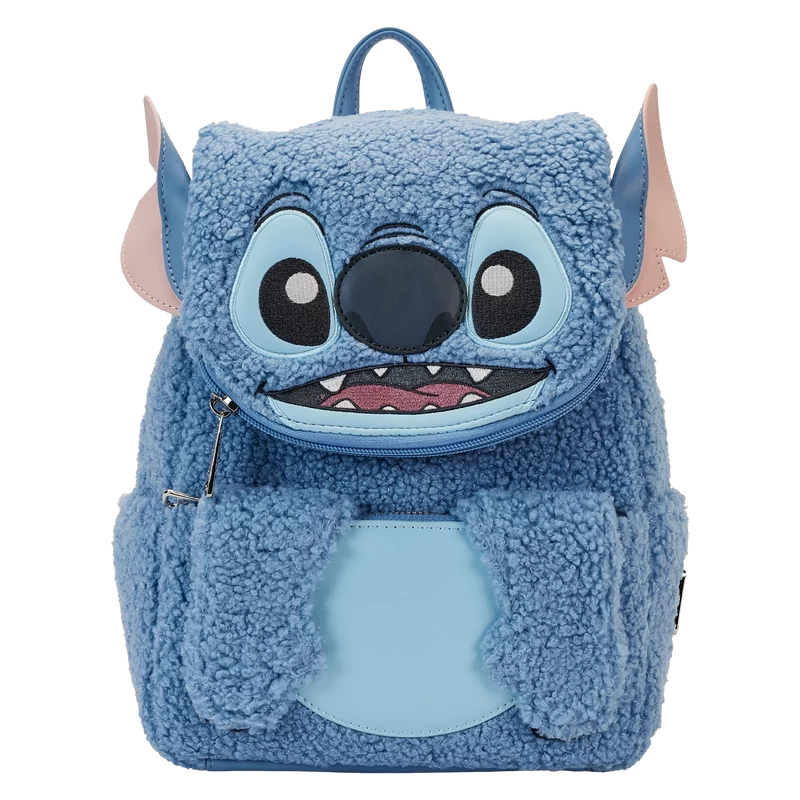 Need to escape? Our Loungefly Disney Stitch Plush Pocket Mini Backpack makes the perfect accomplice! This mini backpack is covered in blue sherpa material, and Stitch’s adorable face appears on the front. Just under his chin, you’ll find a zipper compartment for storing smaller items on your journeys. And, just under his paws, you’ll find another pocket. An invisible magnetic snap allows the paws to stay up while you secure your items. Applique ears poke out on the sides, and Stitch’s face comes to life in embroidered and applique details. On the back, you’ll find Scrump, surrounded by planets. Embrace your journeys in style with this fun and versatile accessory.