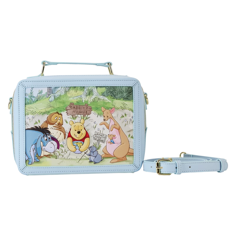 The Loungefly Winnie the Pooh Lunchbox Crossbody Bag is made of vegan leather (polyurethane). Bag has adjustable shoulder strap, hinged top handle, sturdy metal hardware, and features printed details. Take note of the coordinating inside lining.