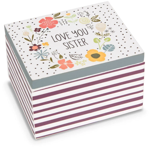 This sweet little box is a perfect gift for your sister to tell her you love her. It features pretty colors and delicate painting. “Love You Sister” text and accompanying floral design are both printed onto the box. She will hold her most treasured small prized items such as jewelry, coins, little notes, dried flowers or anything mini in this box.