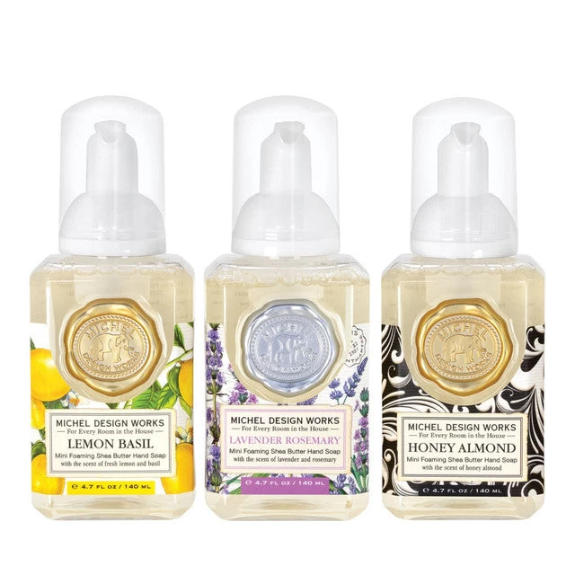 This mini foaming hand soap set is the perfect way to try several of our fragrances! The set features our popular Lavender Rosemary, Lemon Basil, and Honey Almond scents, and contains shea butter and aloe vera for gentle cleansing and moisturizing.