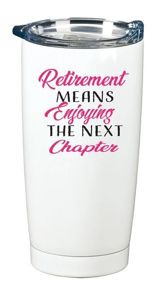RETIRE, INSPIRE, DREAM, INDULGE…Extra Large Stainless Steel White Travel Tumbler 30 oz. It’s made of high quality 18/8 stainless steel; hot drinks stay hot and cold drinks stay cold. The clear plastic lid has a sliding mechanism that easily covers or uncovers the drink opening.