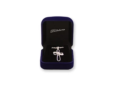 This delicate cross pendant is plated in silver with crystal stone accents. The design is contemporary and unique. Gift boxed. Chain is 16″ long with a 2″ extension.