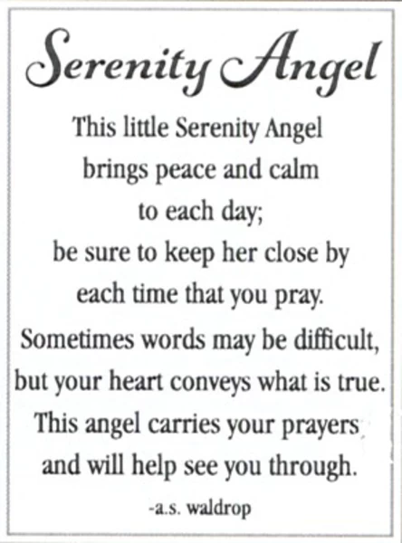 This little Serenity Angel brings peace and calm to each day; be sure to keep her close by each time that you pray. Sometimes words may be difficult, but your heart conveys what is true. This angel carries your prayers and will help see you through.