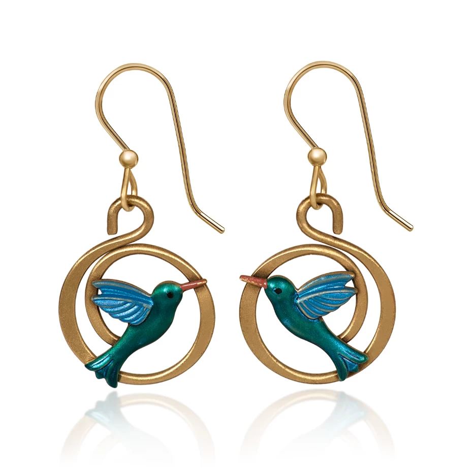 Silver Forest Earrings Blue Hummingbird On Gold Coil