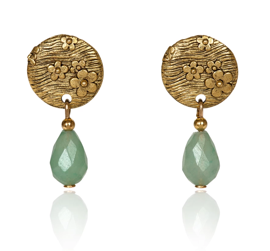 Be the first to review “Silver Forest Floral Stamped Disc With Light Green Gem Drop Earrings” Cancel reply