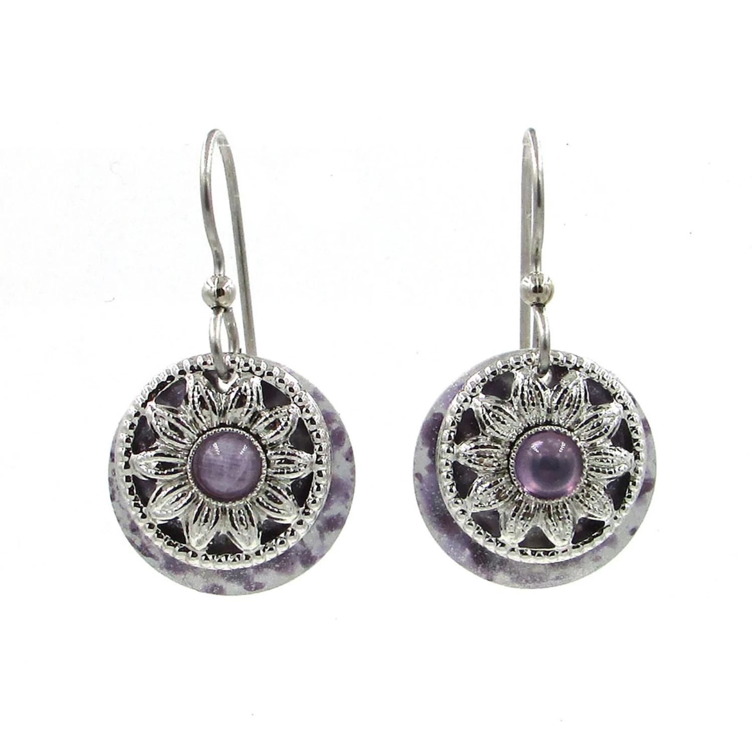 Accent your outfit with a pop of color from this pair of high-quality metal earrings. Round disc earrings are layered with a silver-tone metal flower and shimmering amethyst center stone. The handcrafted, wearable art with surgical steel hooks for metal sensitivities makes a lovely gift for her birthday, anniversary, a holiday or just because.
