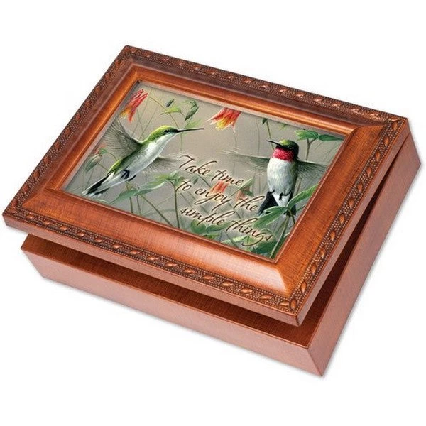 Be encouraged by the marvelous hummingbirds and a message that reads, “Take the time to enjoy the simple things”. Dimensional rope trim design gives this music box classic charm with its hinged lid with woodgrain finish. Plays melodic tune Plays Wind Beneath Wings. It is a perfect gift that will be cherished for years to come for a special someone.