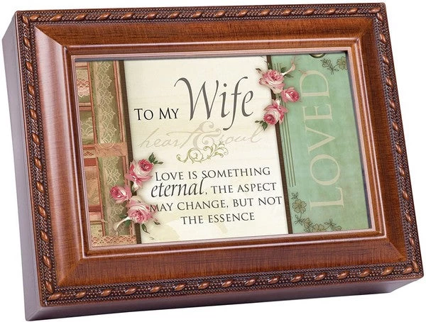 The love of your life will be encouraged by the message that reads, “To My Wife Love is Something Eternal The Aspect May Change But Not the Essence.” This beautiful music box finished with classic wood grain makes the perfect gift for your wife. She will treasure the words and this special gift for years to come. Plays melodic tune Unchained Melody.