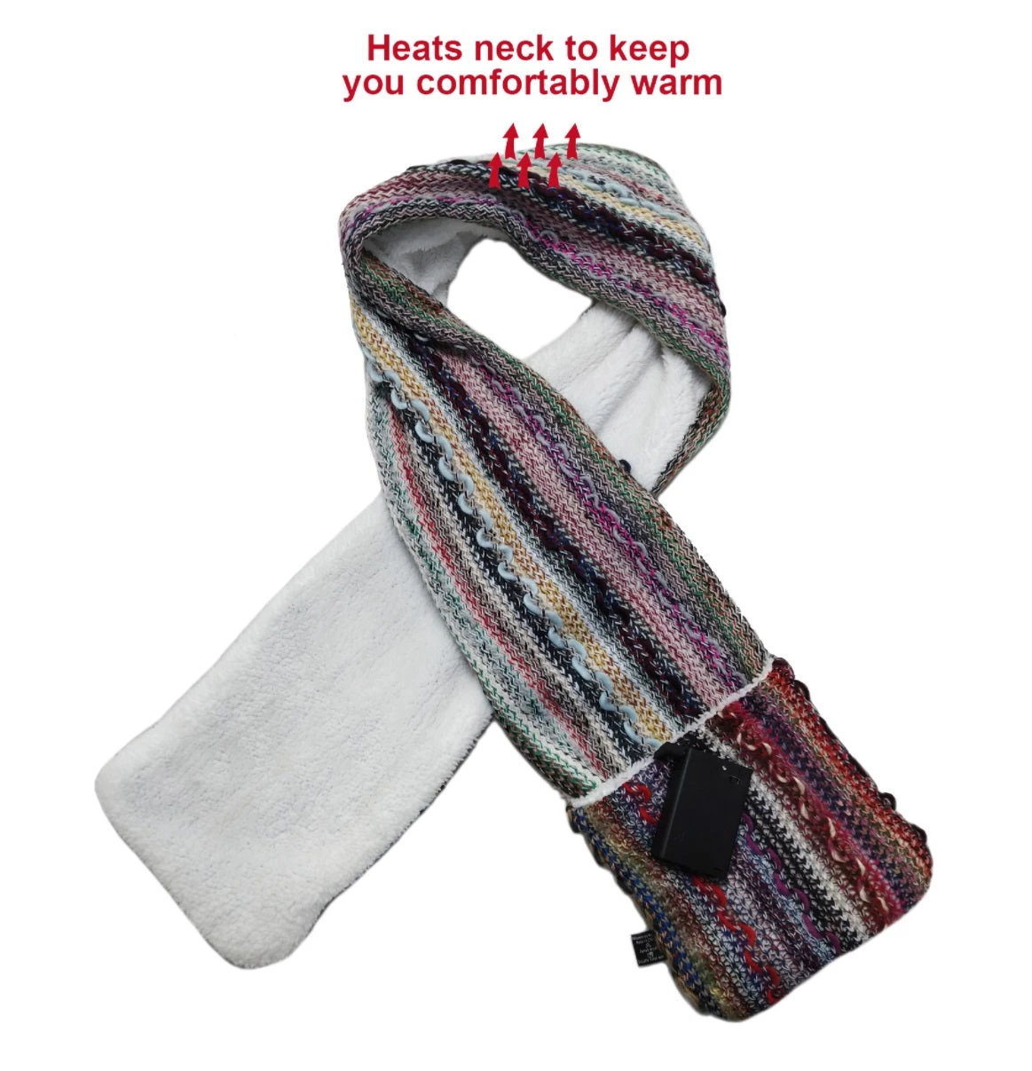 This multi-color heated giving scarf is made from recycled yarn and lined with Sherpa. Warm and soothing on the neck and shoulder, the pockets also keep hands toasty. This battery operated scarf is a great companion for outdoor activities.