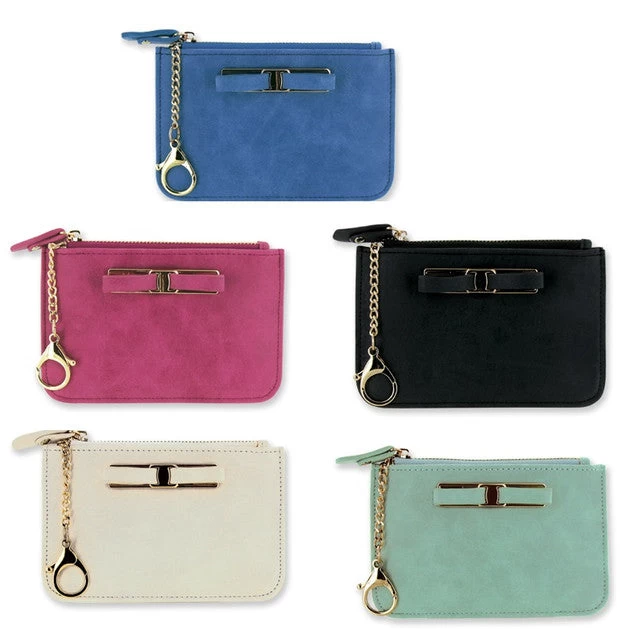 The cute bow embellishment gives this credit card coin purse a luxurious look. It also feels modern in its matte faux leather. It has zip-top closure plus three card slots. The lobster claw on keychain clips to backpacks and purses.